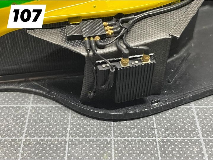ロータス107シリーズ製作、左サイドポンツーン内電子機器を配線…とは言え技術とやる気と考証の限界、そしてカウルとの干渉を考慮して正確性は度外視、あくまで「それらしく」作ってみた。