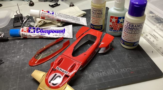 ロータス72シリーズ製作、カウル全力研ぎ出し中。 今回もゴッドハンドの神ヤスを使うが、やはり#2000は自分にはダメらしいので、タミヤのフィニッシングペーパーの#1500〜2000で柚子肌取って、神ヤスは今回も#4000 … 続きを読む EBBRO 1/20 Lotus72製作 Vol.39