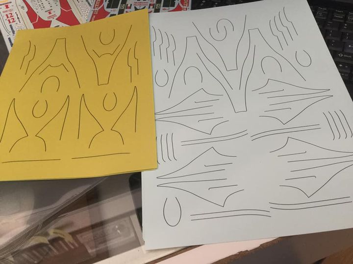 ロータス107シリーズ製作。いよいよ個人的に107Bで一番の関門であるカラーリングに挑む。タミヤもサードパーティーも赤部分はデカールで仕上げる様になっているがココは塗装で行きたい…が、となるとマスキングパターンや境界部分のピンストライプのデカールが必要になる。前回作(失敗)ではキットのデカールのピンストライプ部分を丁寧に切り取って使ったが流石にイマイチだったので、今回は毎度お馴染みALPSのマイクロドライプリンターで印刷。ついでにマスキングシートも作った。
