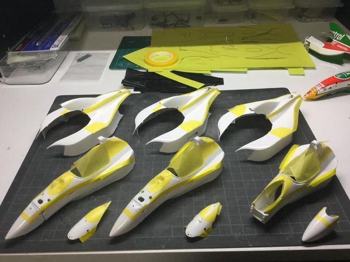 ロータス107シリーズ製作、ちょっと足踏みしていた107Bのマスキング作業開始。ベースとなるホワイトの上からレッド、イエロー、カストロールグリーン、ブリティッシュグリーンの4色を塗り分けるのでマスキングはなかなかエラい作業だけど、まずはレッドから。