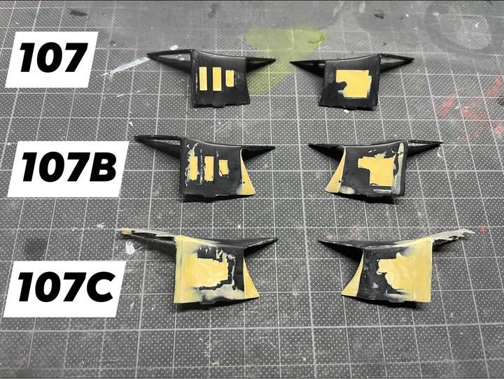 ラジエーターダクト開口部は107では側面がほぼ垂直になっているのに対して107B以後は斜めに切れ込んだ形をしているが、インナーダクトも同様に開口部が斜めになっているのでプラ板とエポキシパテで斜めに整形。また電子機器類はモールドが一体になっているので全て超音波カッターで切り離してエポキシで埋める。