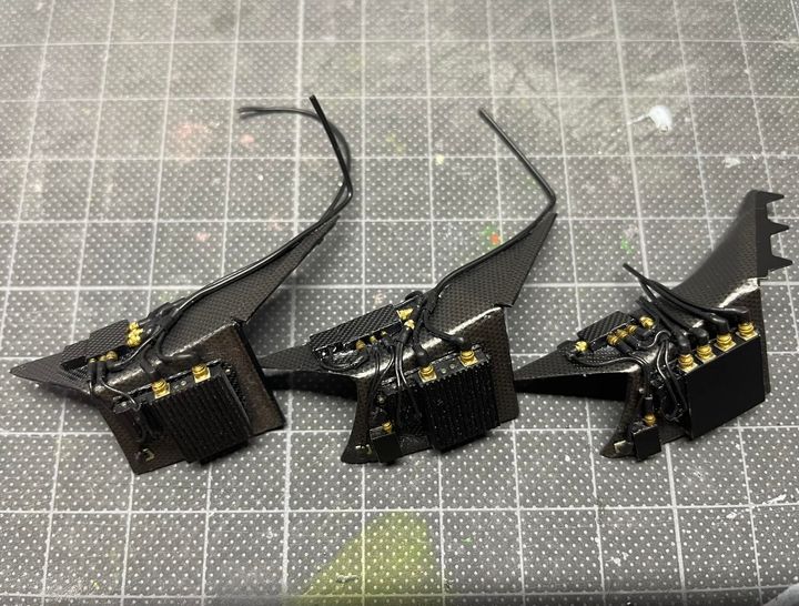 ロータス107シリーズ製作、左サイドポンツーン内電子機器を配線…とは言え技術とやる気と考証の限界、そしてカウルとの干渉を考慮して正確性は度外視、あくまで「それらしく」作ってみた。