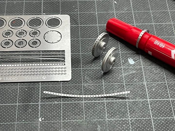 側面の帯状のエッチングパーツは予めペンに巻き付けてクセ付けてからディスクへ接着。塗装は側面にライトガンメタル、表面はガンメタルに塗り分けたけど、あまり違いは出なかった… 汗