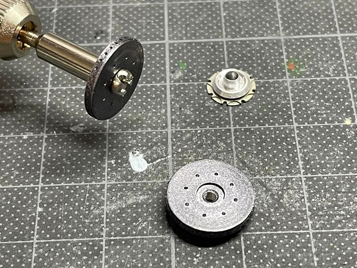最後にマンドレールに挟んでリューターに装着、回しながら1000番のペーパーでディスク表面を軽く擦って使用感を出してみた。