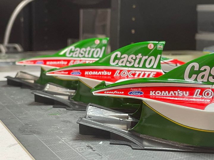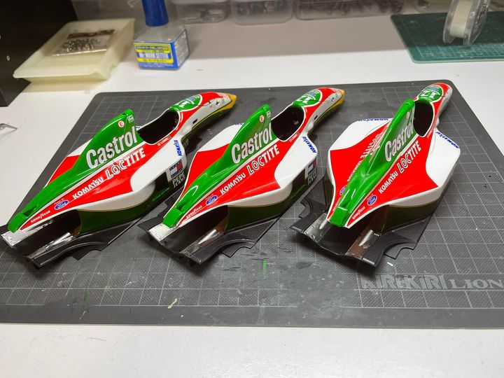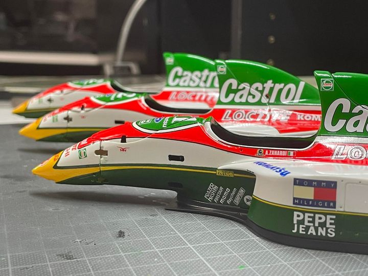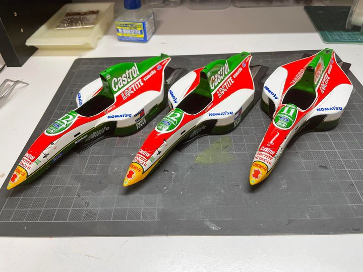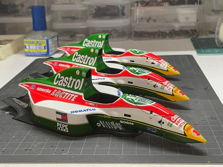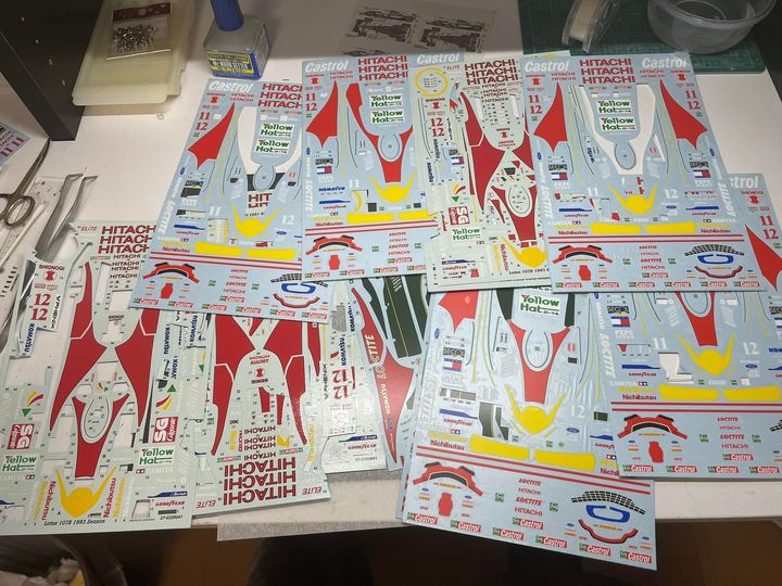 ロータス107シリーズ製作、107Bのデカールを3台分、モノコックとカウルを貼り終えた。メインはやはりSTUDIO27のカルトグラフを使い、考証の問題や色味が欲しい部分はミュージアムコレクションの剥離やタミヤも使ったが、3台も並べてみるとなかなか壮観、まるでピット前みたいだ。