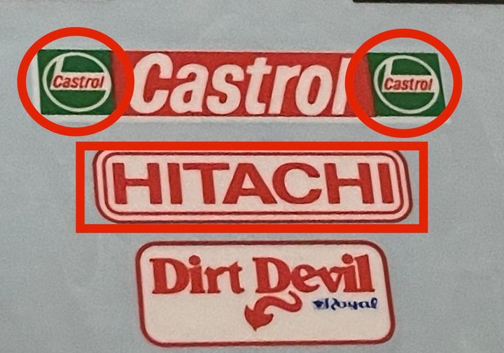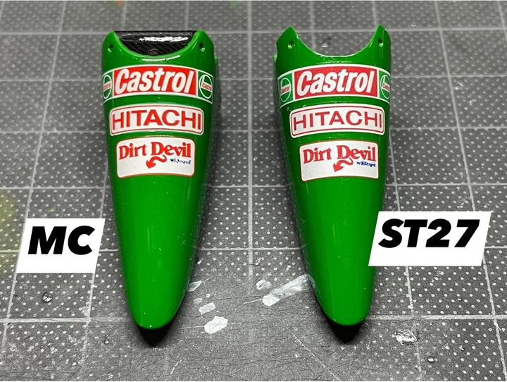 フロントノーズのカストロールと日立のロゴ、右はSTUDIO27、左はミュージアムコレクションの剥離デカール。形状的に正しいのは27、ミューコレはカストロールの両脇のロゴが中央の赤帯に接してしまっているのを切り離し、タミヤのデカールから切り取った白枠の上から貼って対応。日立のロゴは何故か赤枠が二重になっているので外側を丁寧に切り取って、同じくタミヤの白枠の上に貼った。