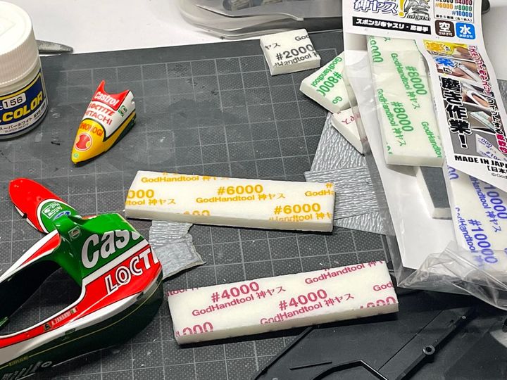ただ#2000が粗過ぎに感じる。個人的な感触では#800位な感じで、仕上げ吹きした後に使ったら表面が傷だらけになってしまい、更に傷消しで収拾付かなくなりストライプデカールが削れてしまった。止む無くデカール貼り直して仕上げ吹きやり直し、時間無いんだから勘弁して。泣